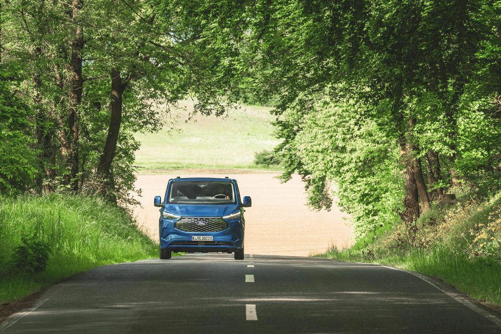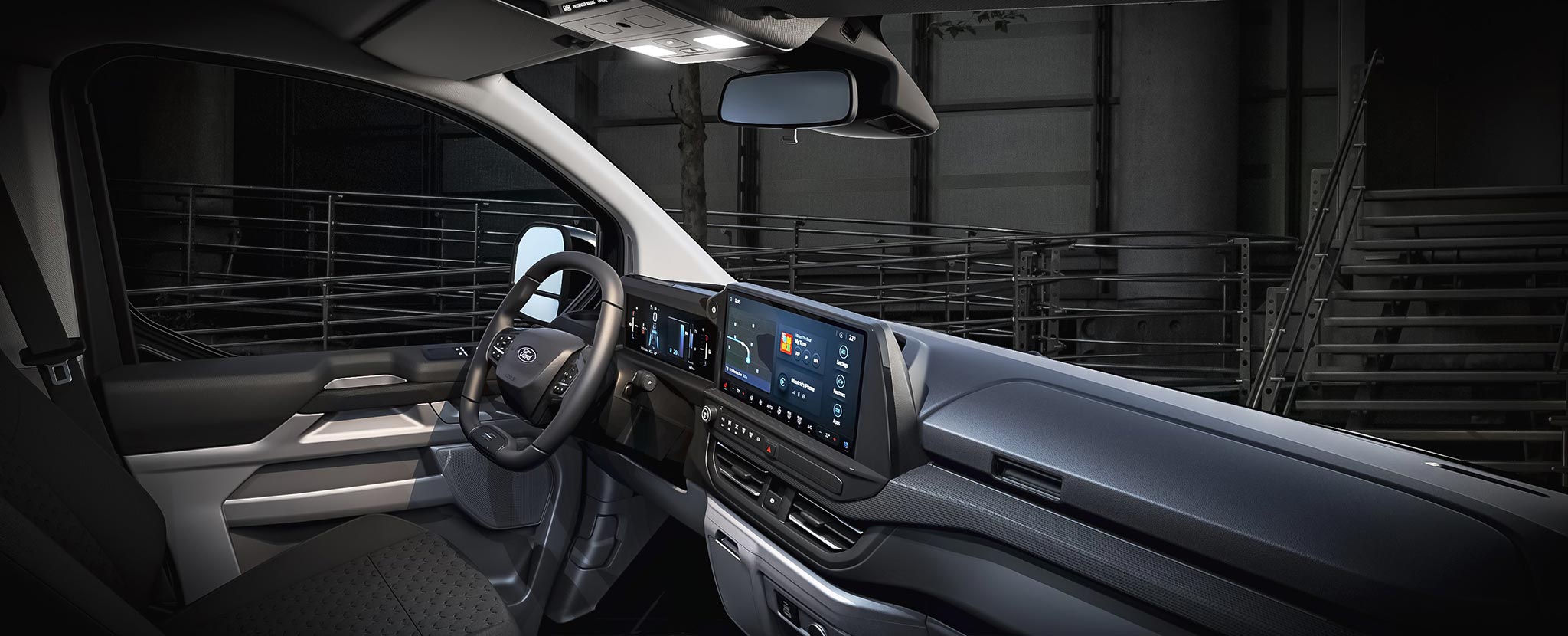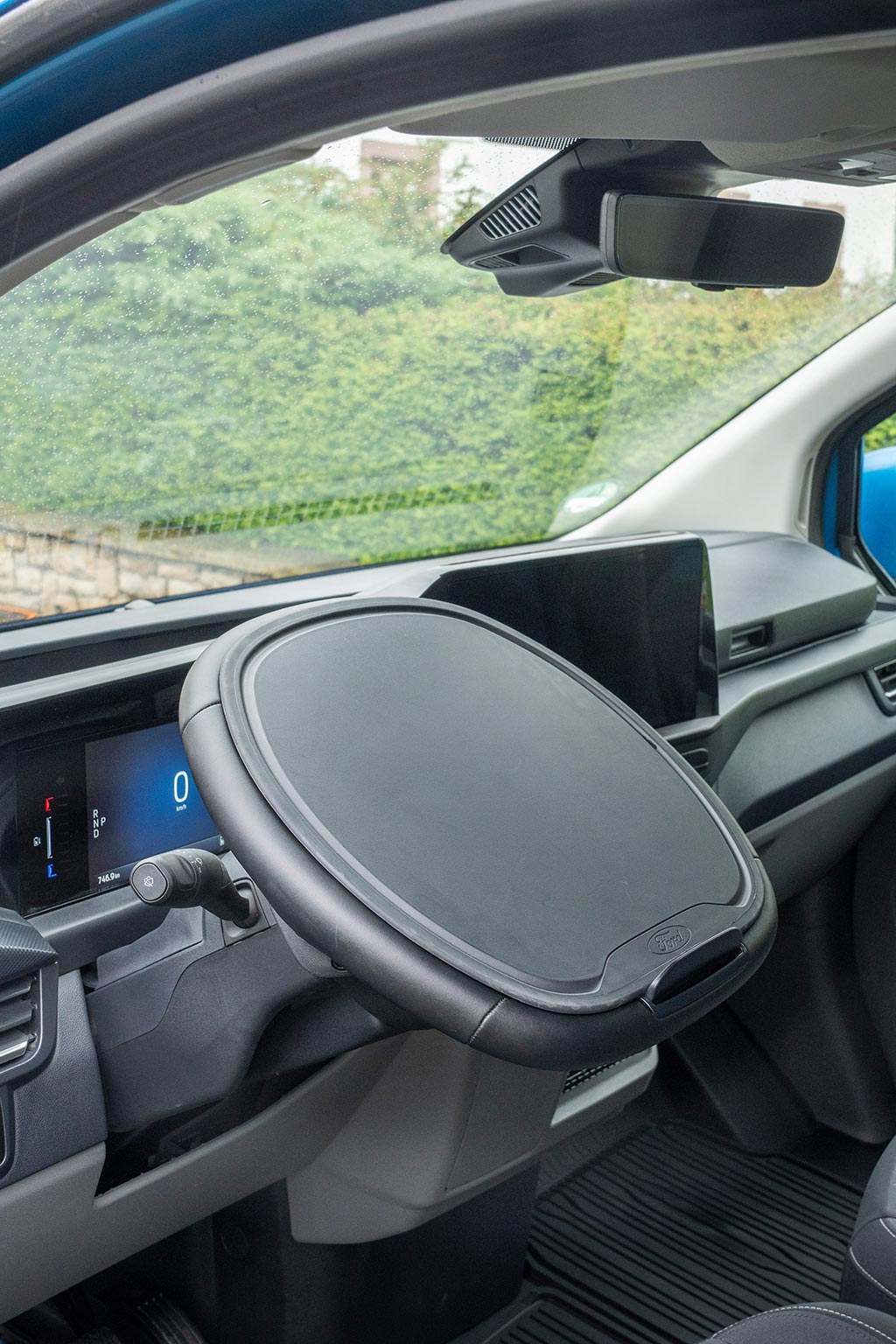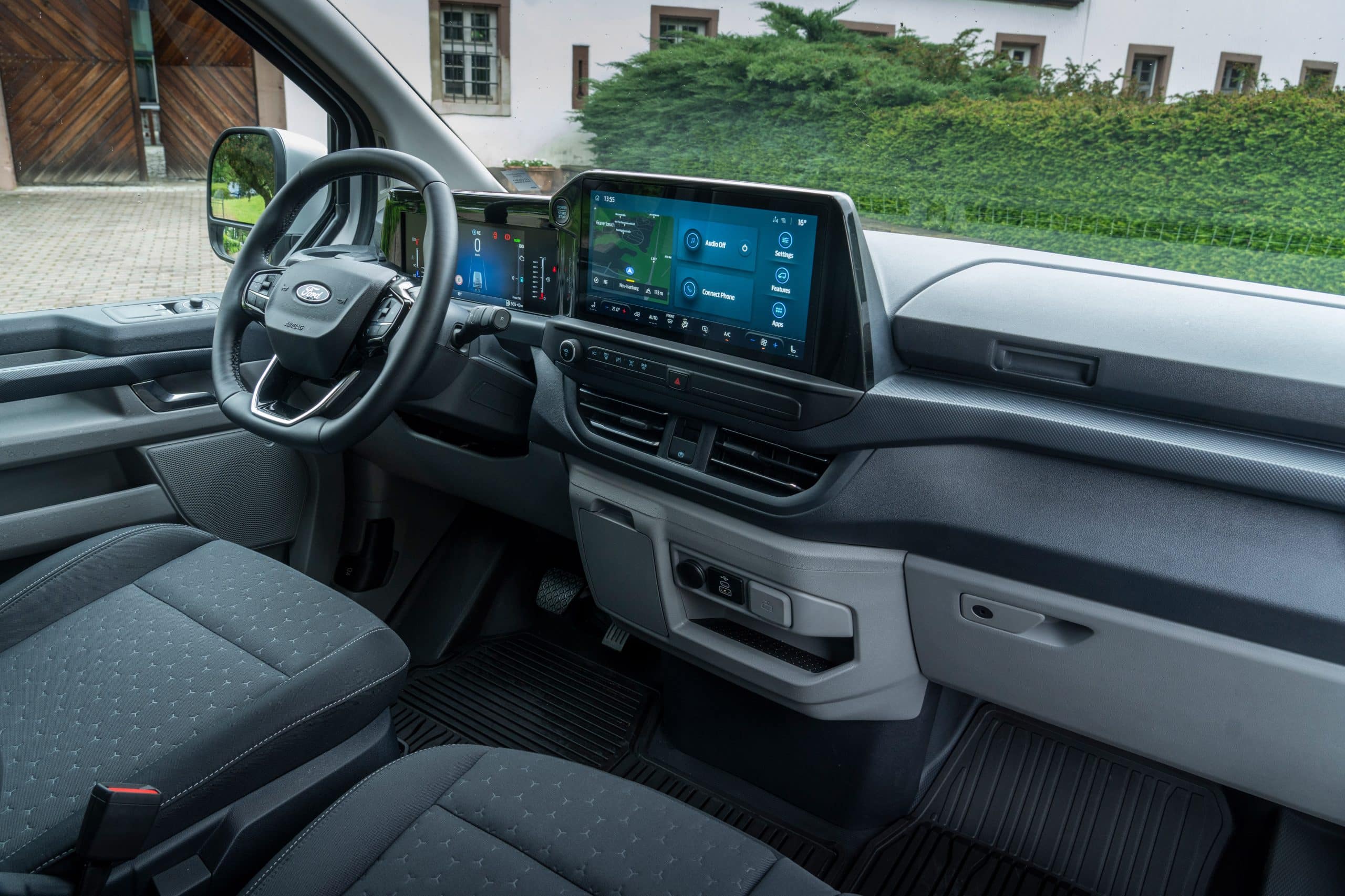 La cabina evoluciona hacia un entorno silencioso, organizado y digital. El airbag de pasajero en techo libera huecos de almacenamiento; los asientos mejoran sujeción y resistencia; abundan tomas USB‑C de alta potencia y 12V, y, según versión, toma 230V. El volante abatible forma una mesa estable para portátil o documentación, integrándose con superficies planas y anclajes que evitan movimientos a bordo. SYNC 4 (13”) con 5G se vincula a Ford Pro para telemática, mantenimiento predictivo y gestión remota; en EV/PHEV añade planificación de carga y pre‑acondicionamiento. En DCiV (doble cabina) la segunda fila queda aislada por tabique; Tourneo Custom hereda plataforma con módulos de asientos deslizantes para transporte de personal.