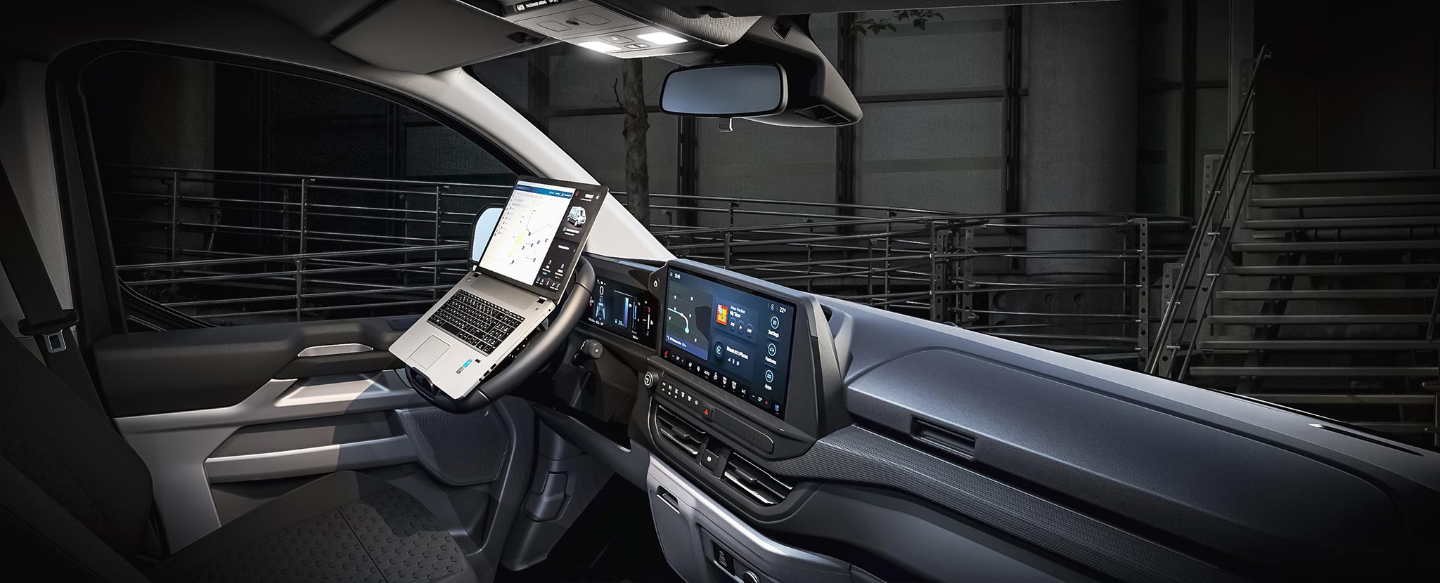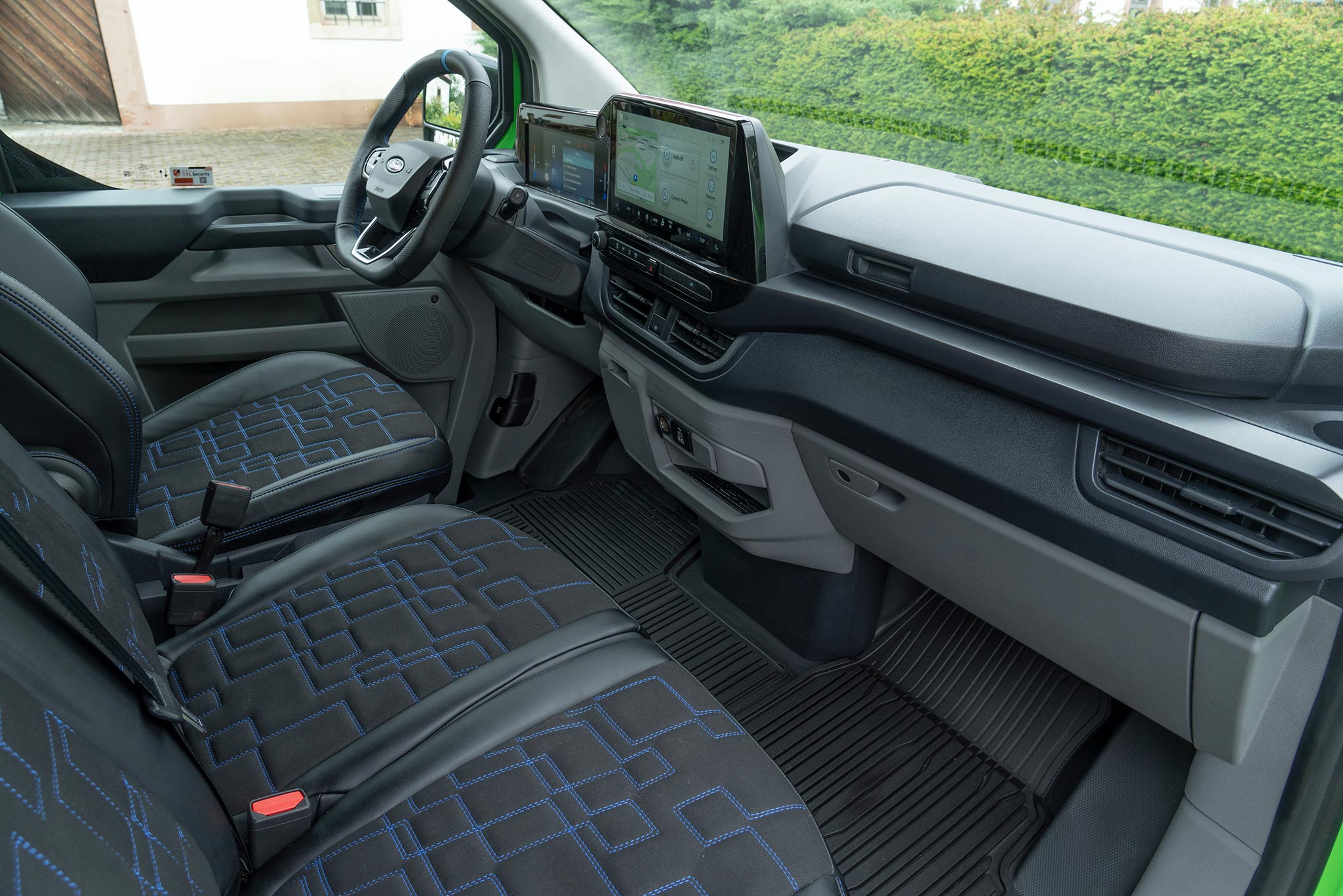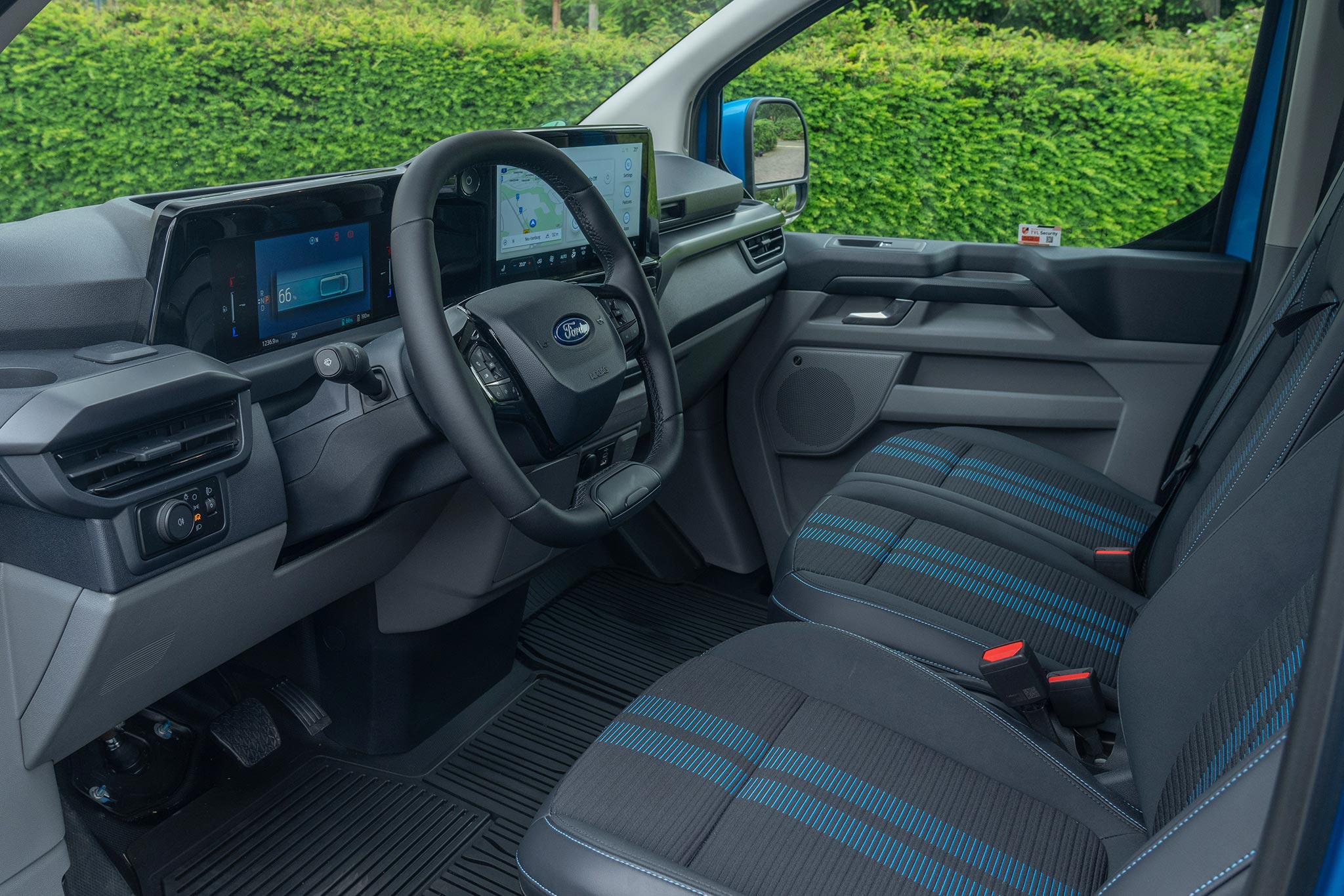 La cabina evoluciona hacia un entorno silencioso, organizado y digital. El airbag de pasajero en techo libera huecos de almacenamiento; los asientos mejoran sujeción y resistencia; abundan tomas USB‑C de alta potencia y 12V, y, según versión, toma 230V. El volante abatible forma una mesa estable para portátil o documentación, integrándose con superficies planas y anclajes que evitan movimientos a bordo. SYNC 4 (13”) con 5G se vincula a Ford Pro para telemática, mantenimiento predictivo y gestión remota; en EV/PHEV añade planificación de carga y pre‑acondicionamiento. En DCiV (doble cabina) la segunda fila queda aislada por tabique; Tourneo Custom hereda plataforma con módulos de asientos deslizantes para transporte de personal.