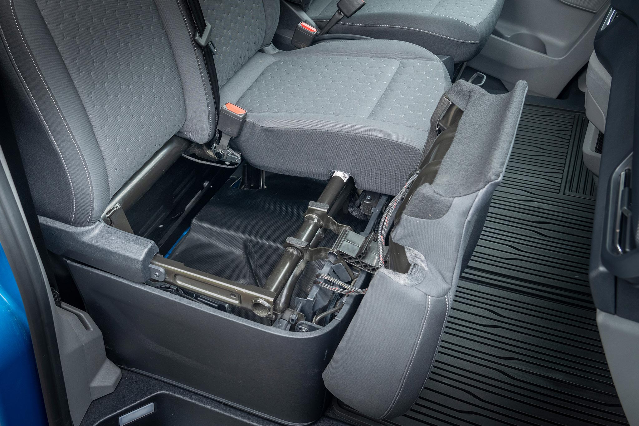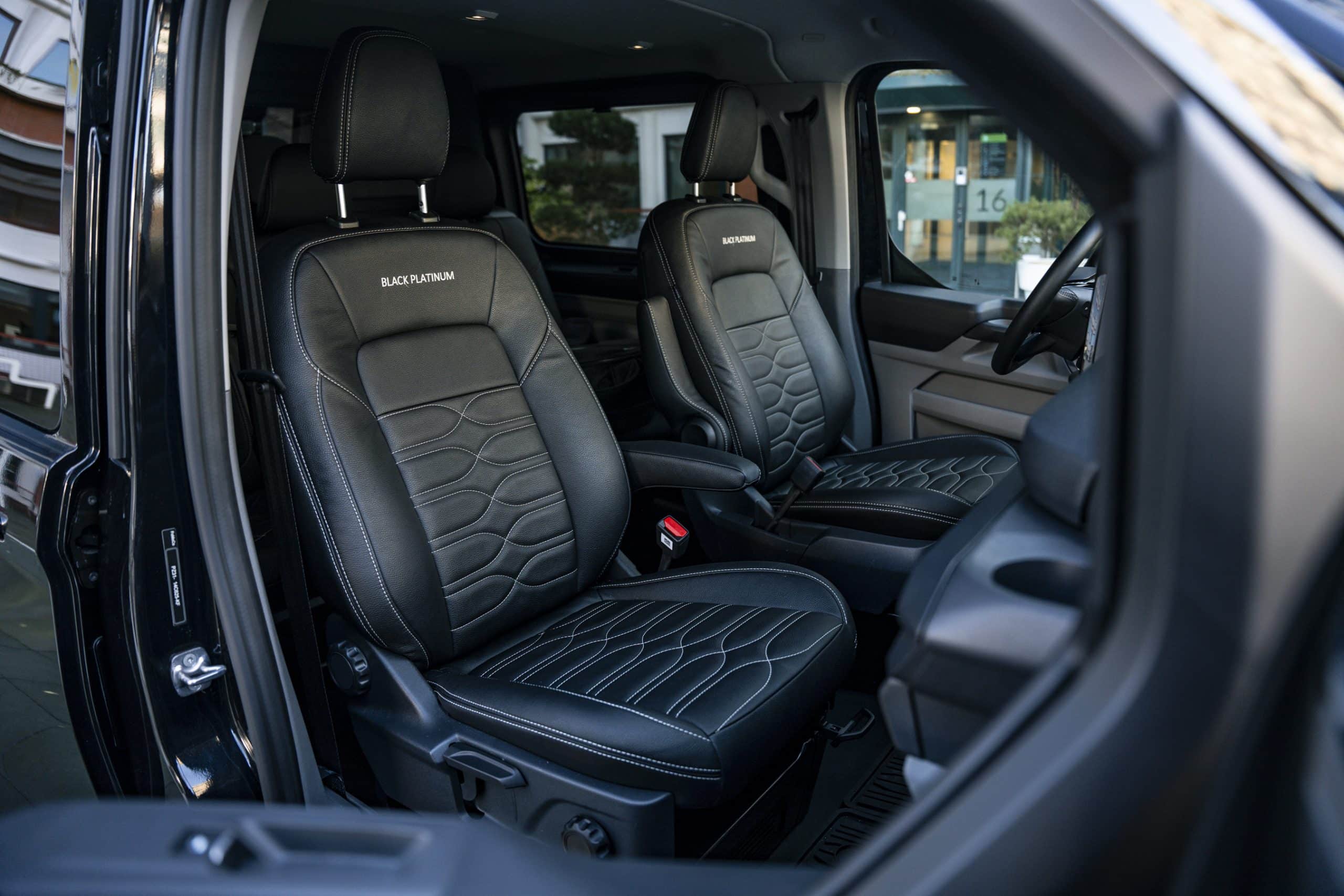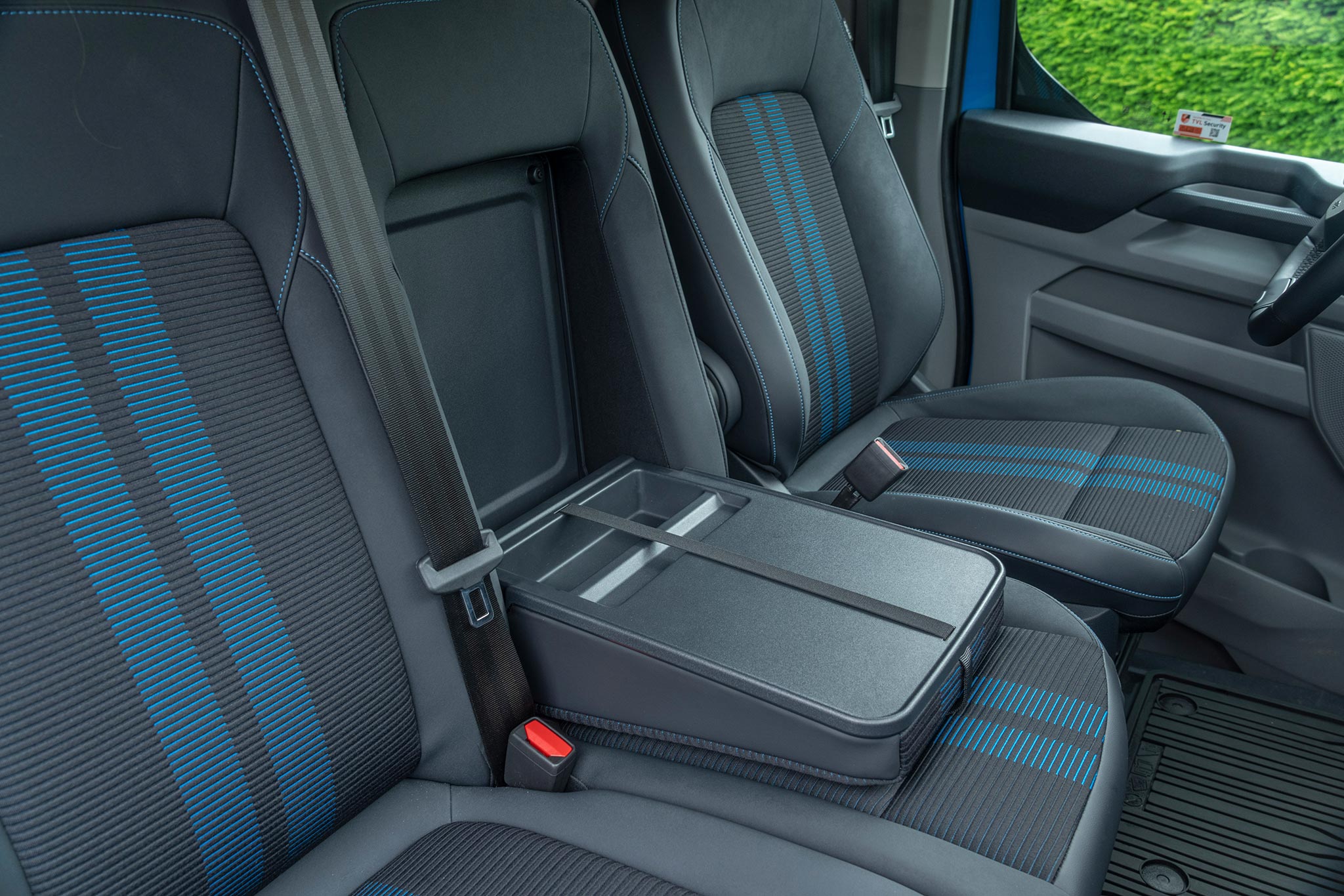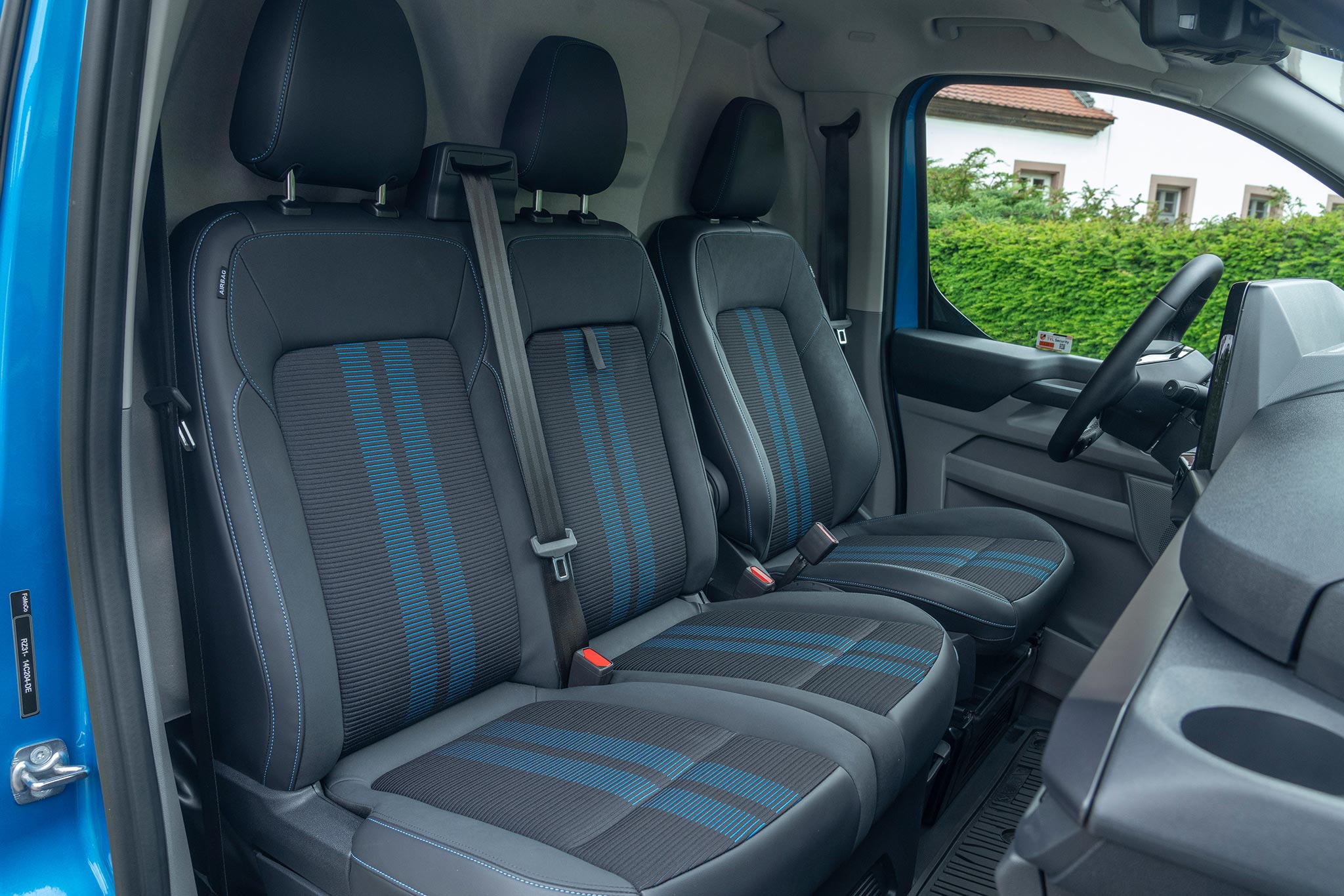 La cabina evoluciona hacia un entorno silencioso, organizado y digital. El airbag de pasajero en techo libera huecos de almacenamiento; los asientos mejoran sujeción y resistencia; abundan tomas USB‑C de alta potencia y 12V, y, según versión, toma 230V. El volante abatible forma una mesa estable para portátil o documentación, integrándose con superficies planas y anclajes que evitan movimientos a bordo. SYNC 4 (13”) con 5G se vincula a Ford Pro para telemática, mantenimiento predictivo y gestión remota; en EV/PHEV añade planificación de carga y pre‑acondicionamiento. En DCiV (doble cabina) la segunda fila queda aislada por tabique; Tourneo Custom hereda plataforma con módulos de asientos deslizantes para transporte de personal.